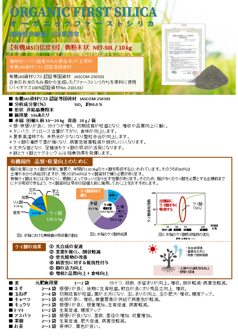 土の中にはケイ酸が最も多く存在しますが、緩効性で効きにくいものです。アルカリに注意してください。化学肥料ではケイ酸加里であるとかケイ酸カルシウムとか色々ありますが、有機JAS適合ではありません。有機JAS適合では以前に鉱物を低温焼成した効果の高い肥料がありましたが、現在は販売中止になっています。良い肥料でしたが、販売再開の目途が全く立たなく、弊社としてはあきらめざるを得なく他の検討をしました。
