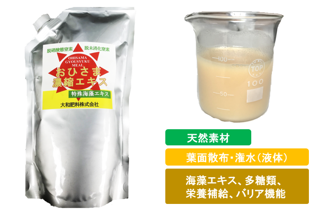 ・農業利用においては、葉面吸収や潅水による根からの養分吸収や窒素同化の促進による食味・品質向上が期待でき、葉面散布によるバリア保護機能により、病害虫の侵入の防御機能や傷ついた部分の修復機能、樹勢回復など多方面に機能いたします。