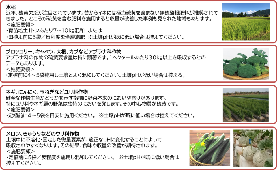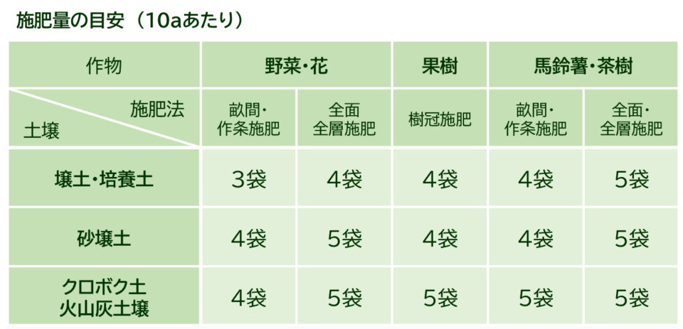 【施用量】10aあたりの施用量 *土壌PHを現行より1下げる場合の目安です。