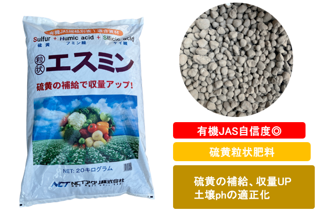 エスミンに含まれる硫黄は、土壌中で硫黄酸化菌の影響を受け土壌PHを下げ酸性に変化させます。