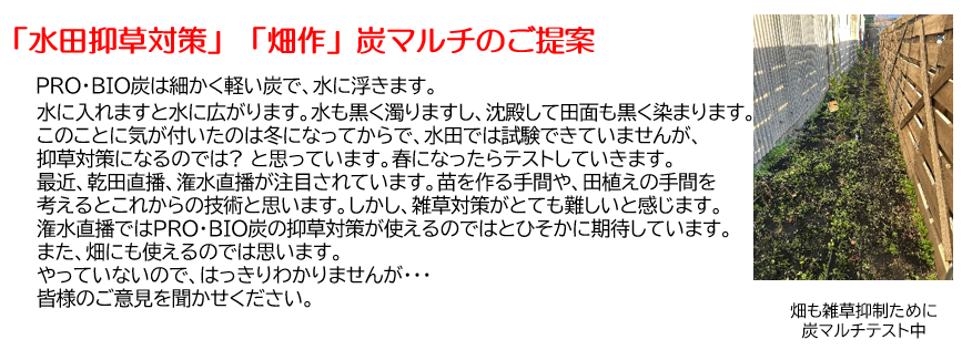 - 炭の多孔質に乳酸菌・酵母菌・放線菌・光合成細菌・麹菌・バチルスチュ-リンゲシス菌(BT菌)・バチルスサブチルス菌・ア-キア古細菌などの微生物を生息させ、土壌微生物を活性化いたします。